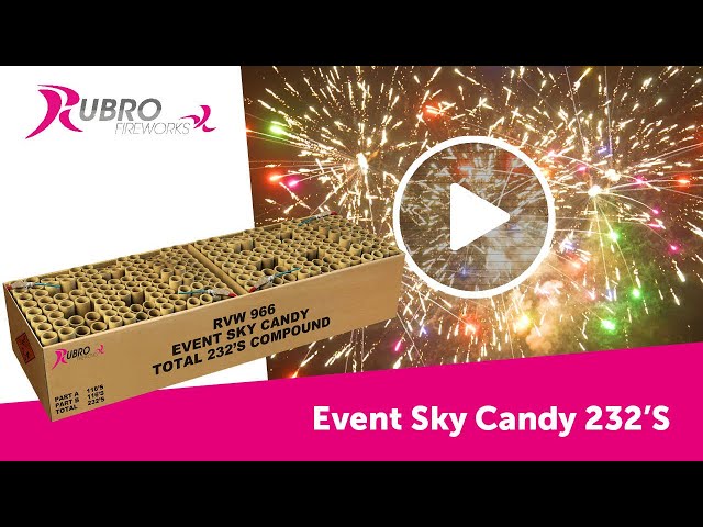 Lust voor het oog! 232 schoten verdeeld over 2 delen. 25 & 30 mm kaliber, extreem zwaar gevuld. Sky Candy = puur vuurwerkspektakel.